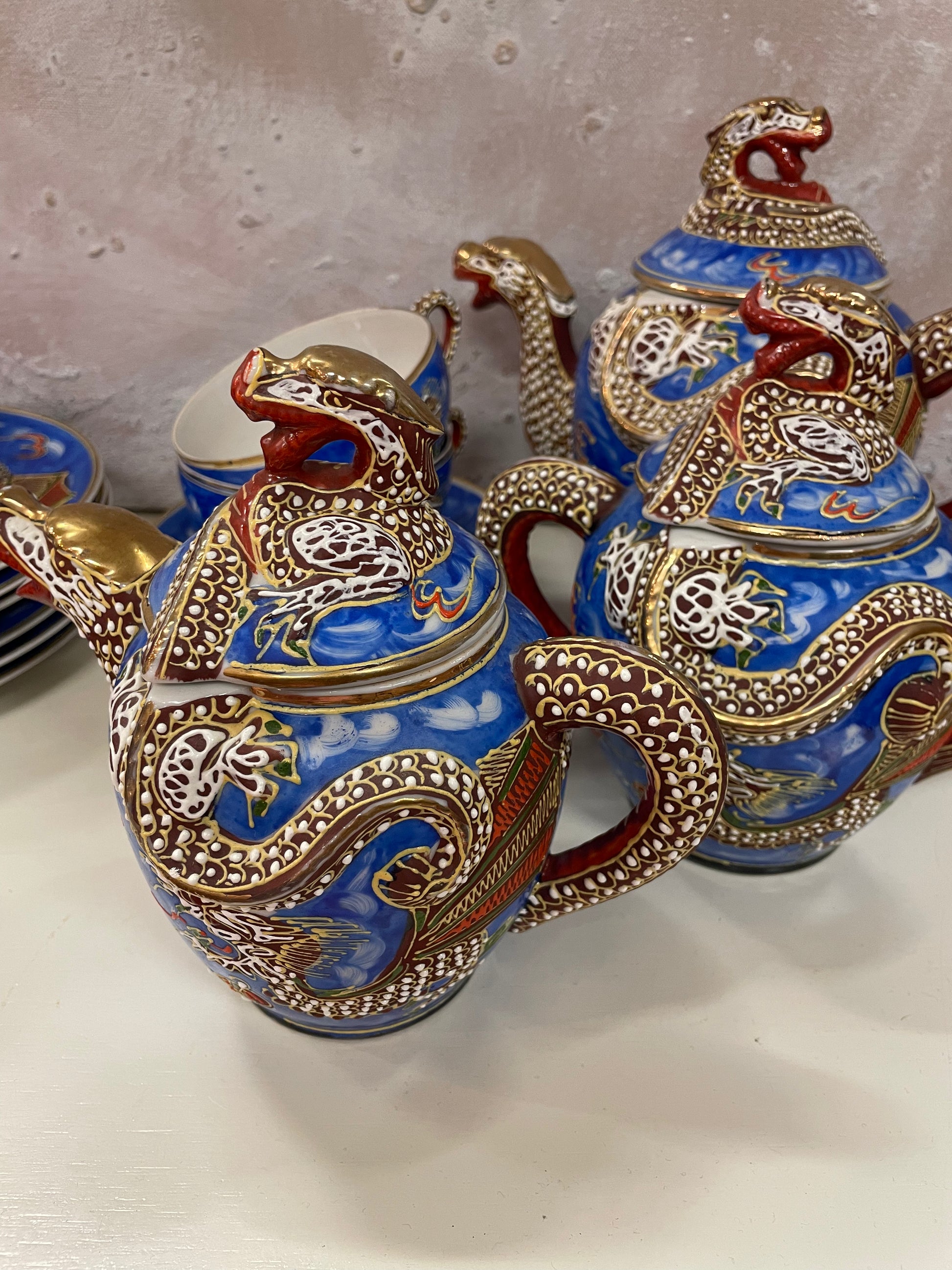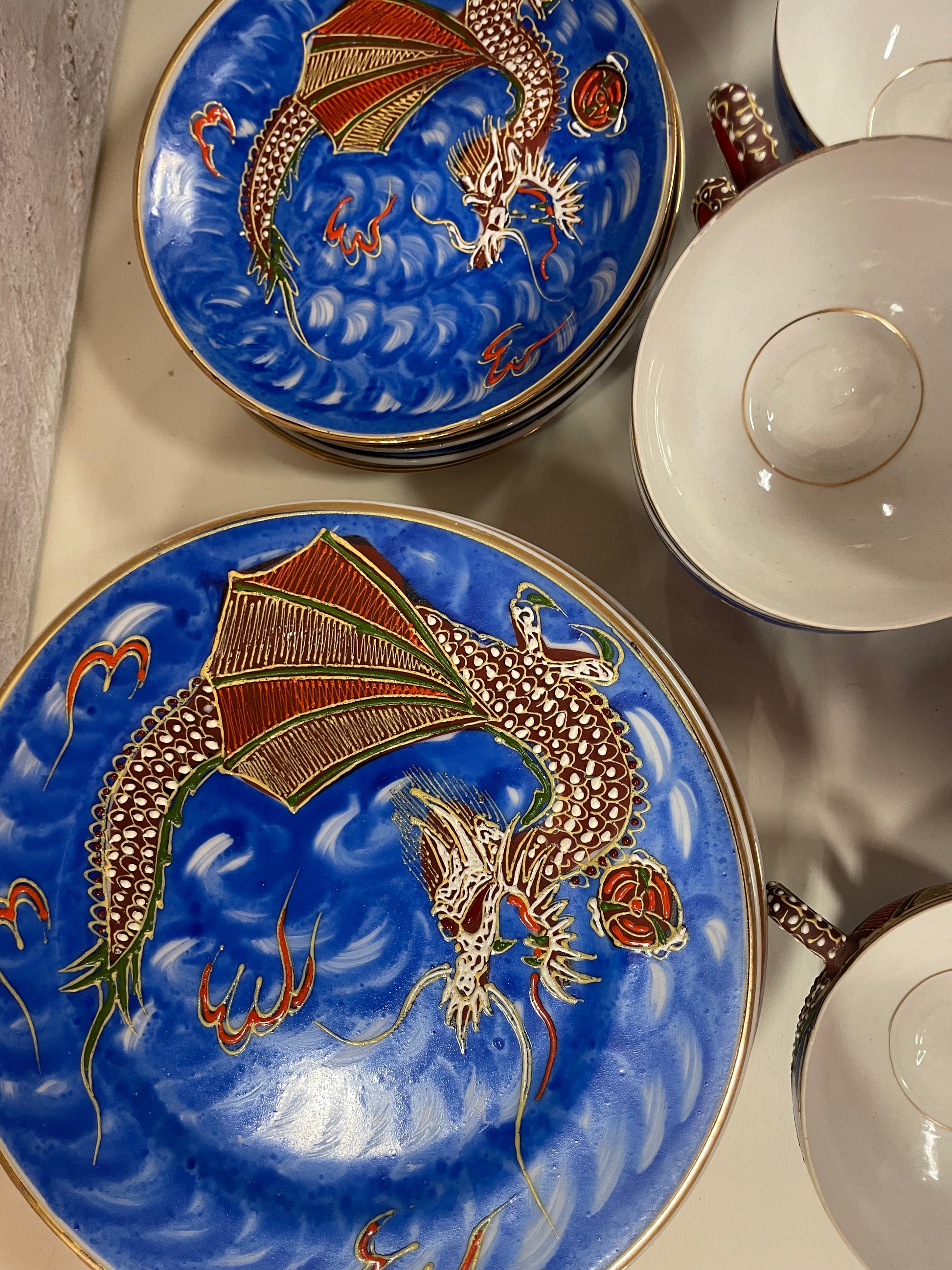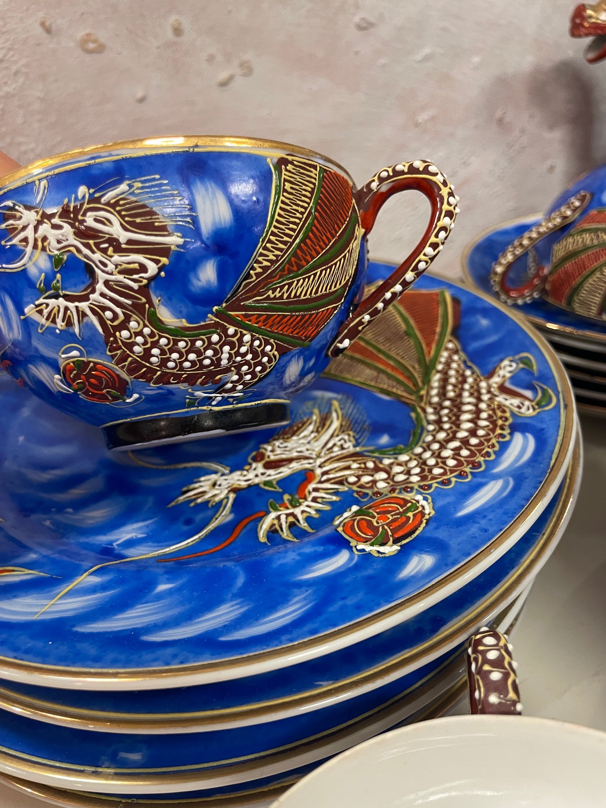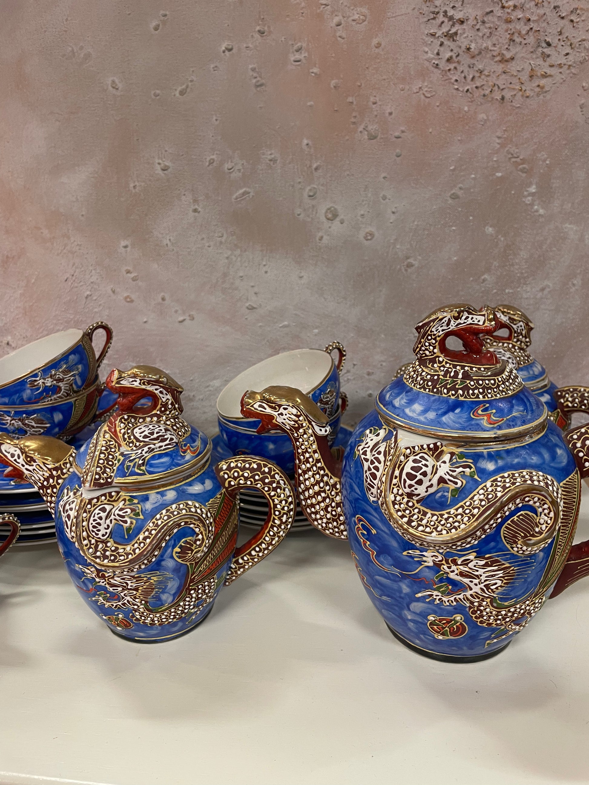 Dette setter brukte sjømenn å kjøpe med hjem til mødrene sine på 80’tallet. Nydelig sett. To kammer og en mugge. 6 kopper, 6 små fat, 6 frokostfat.