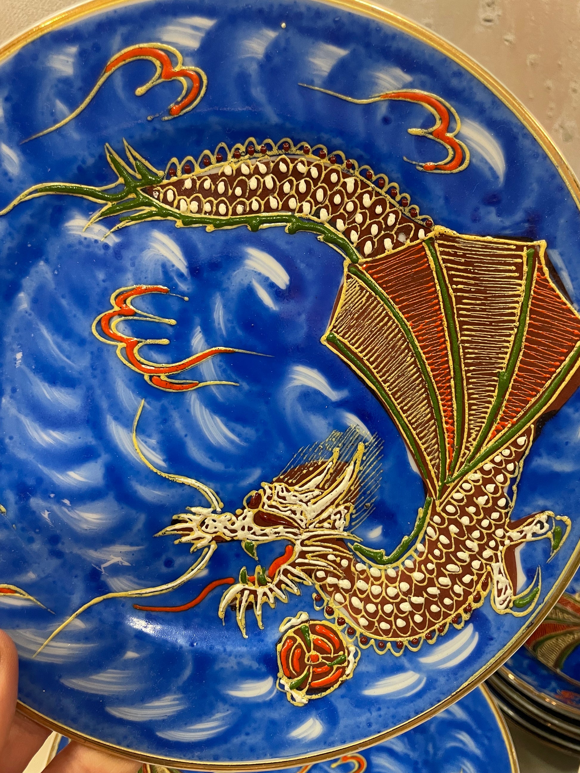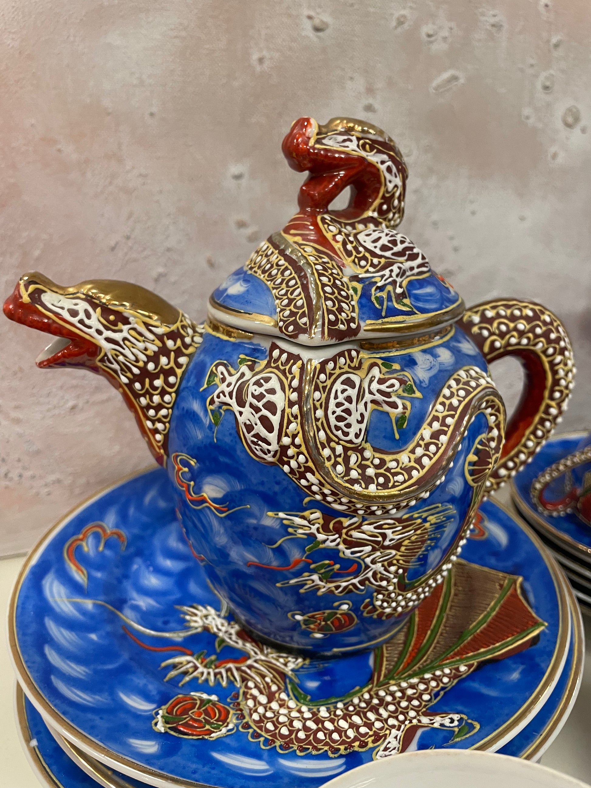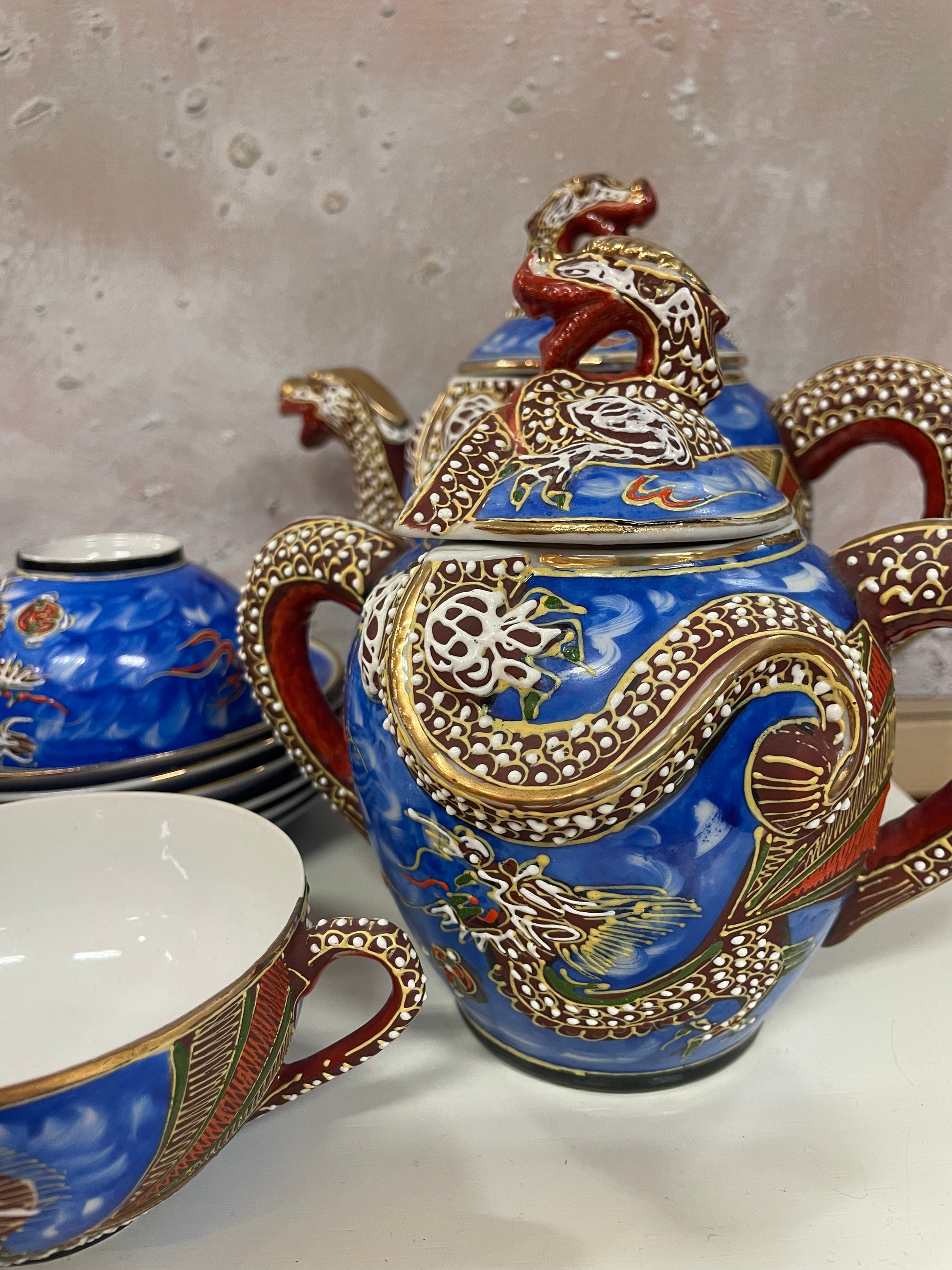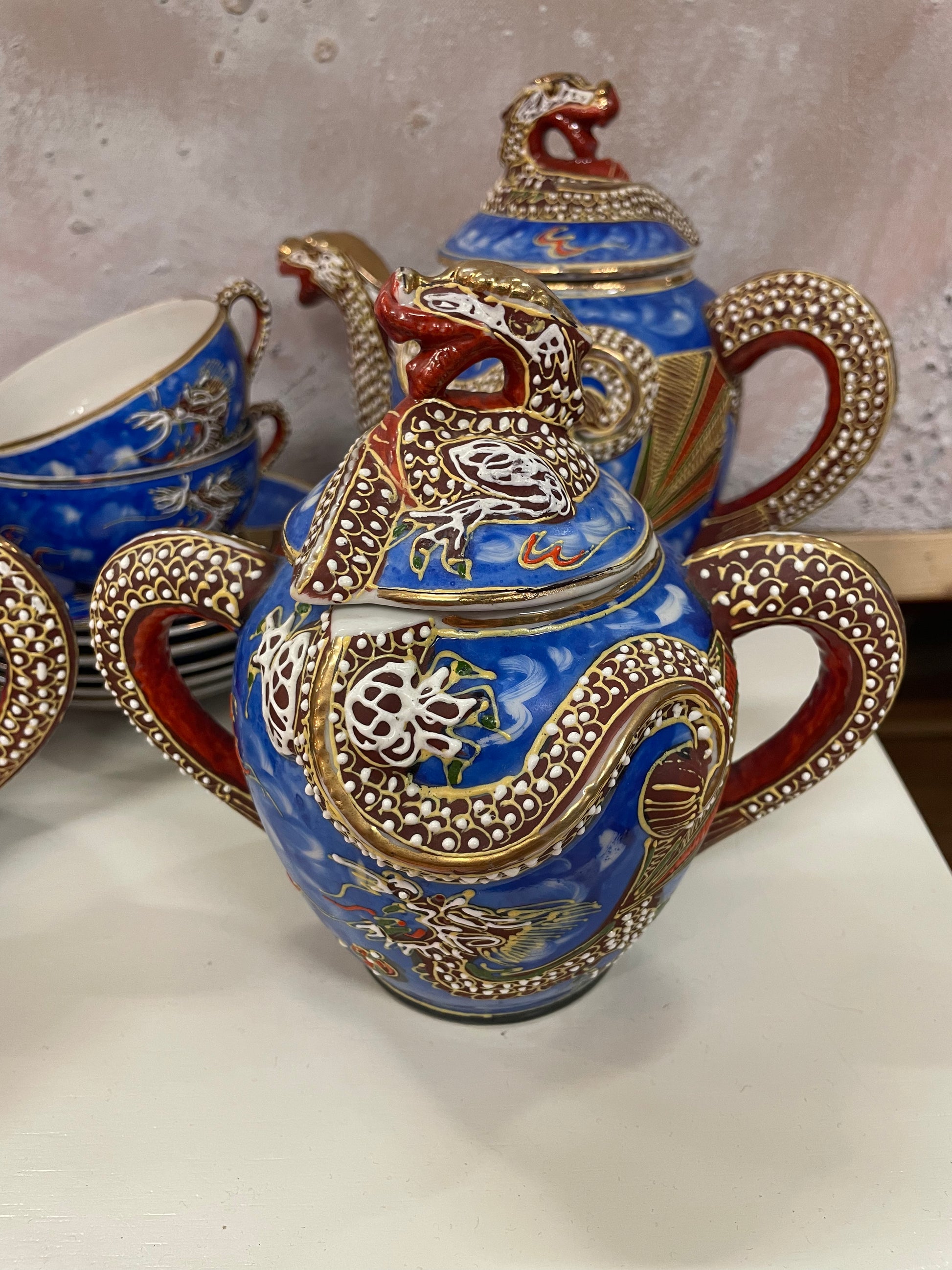 Dette setter brukte sjømenn å kjøpe med hjem til mødrene sine på 80’tallet. Nydelig sett. To kammer og en mugge. 6 kopper, 6 små fat, 6 frokostfat.