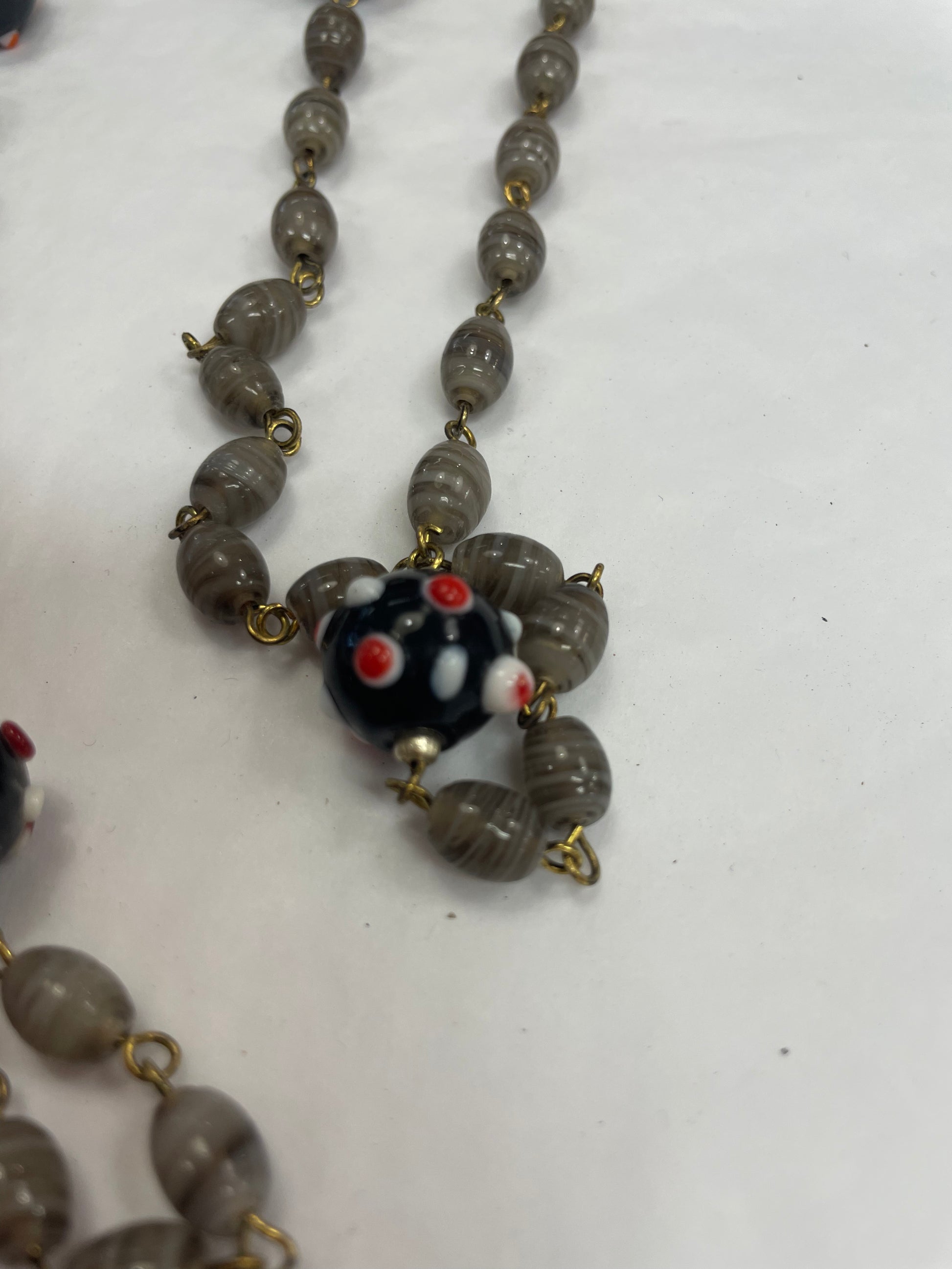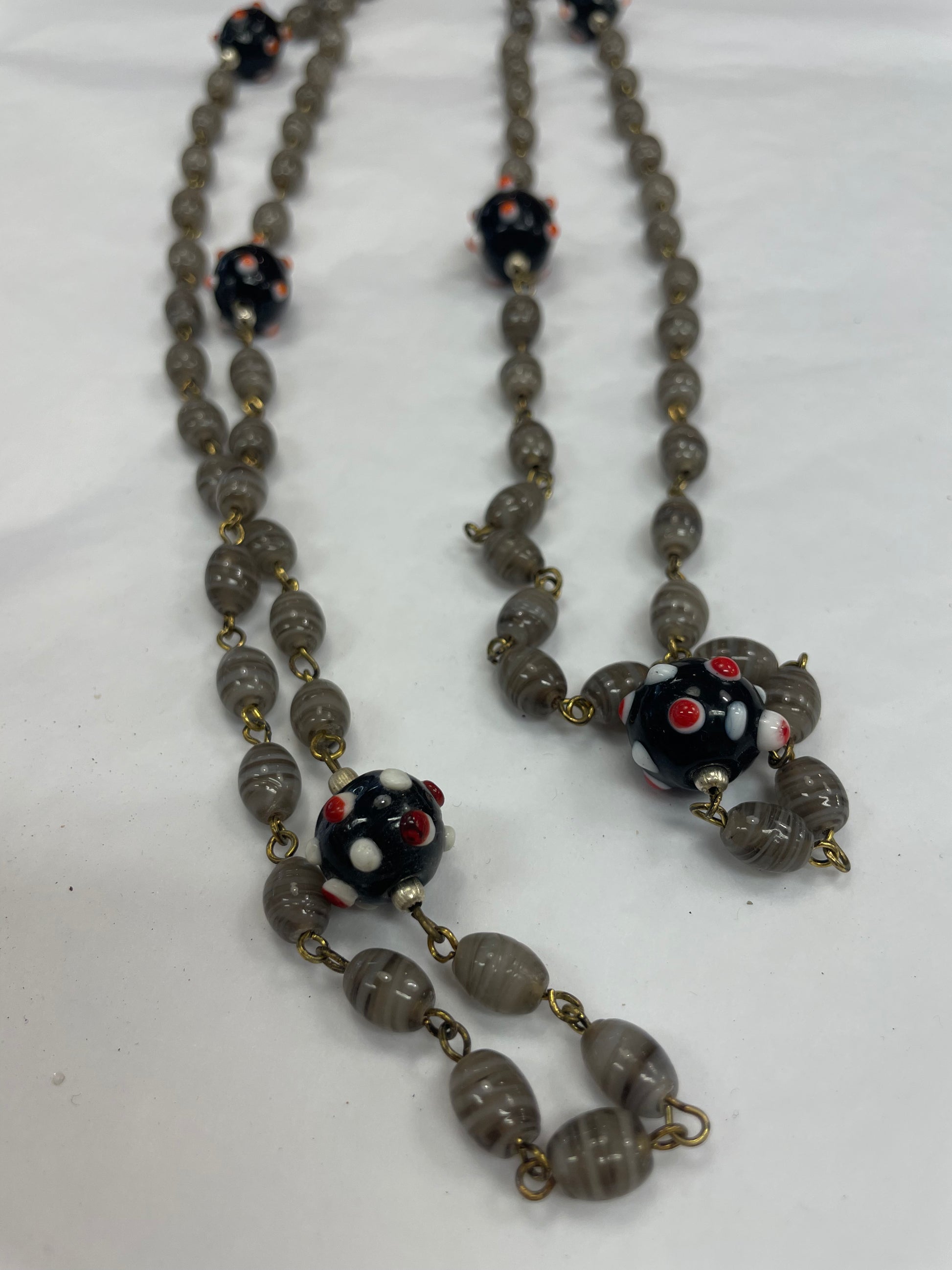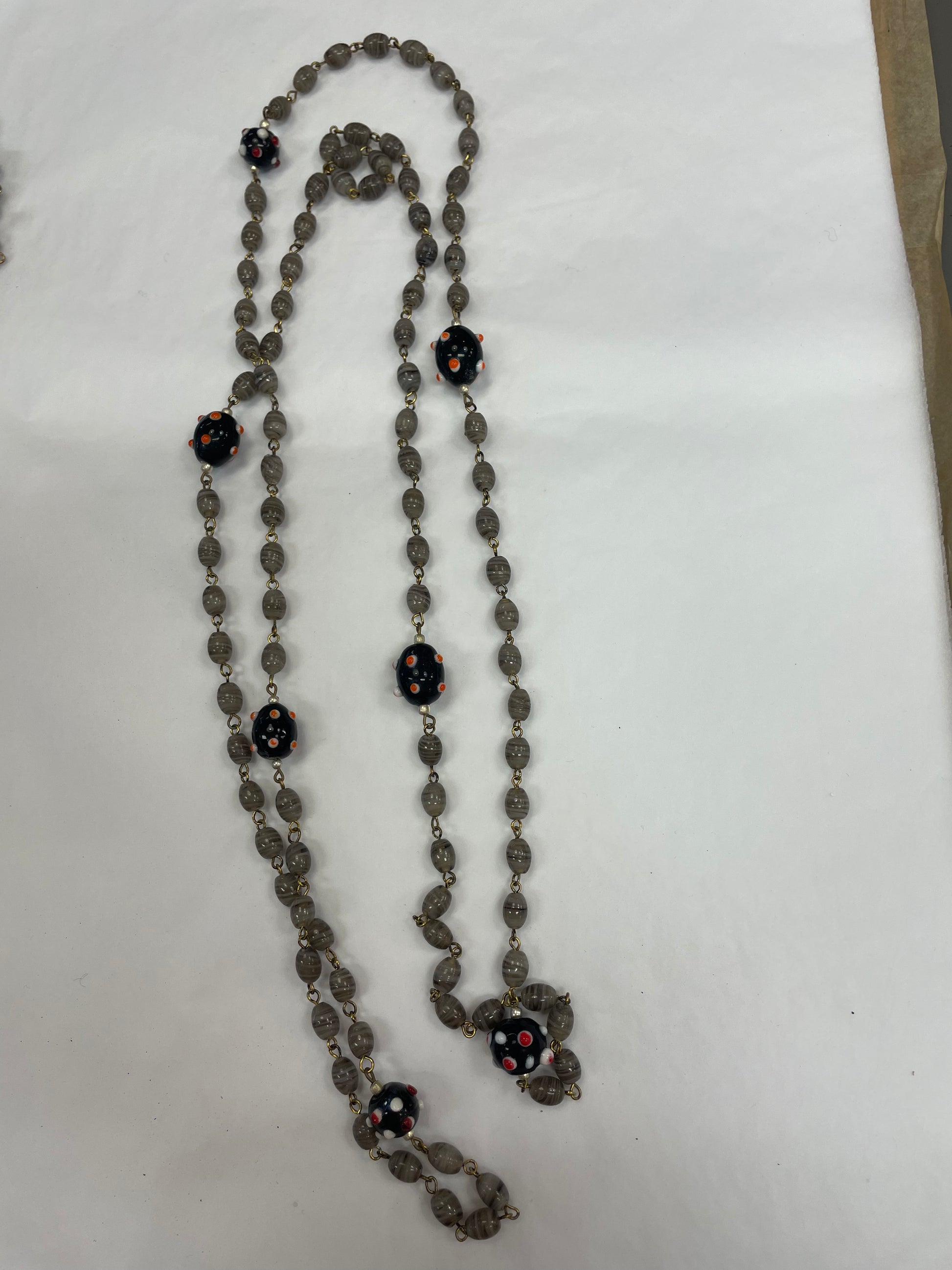 Langt smykke med grå og svarte glasstener . Ubrukt