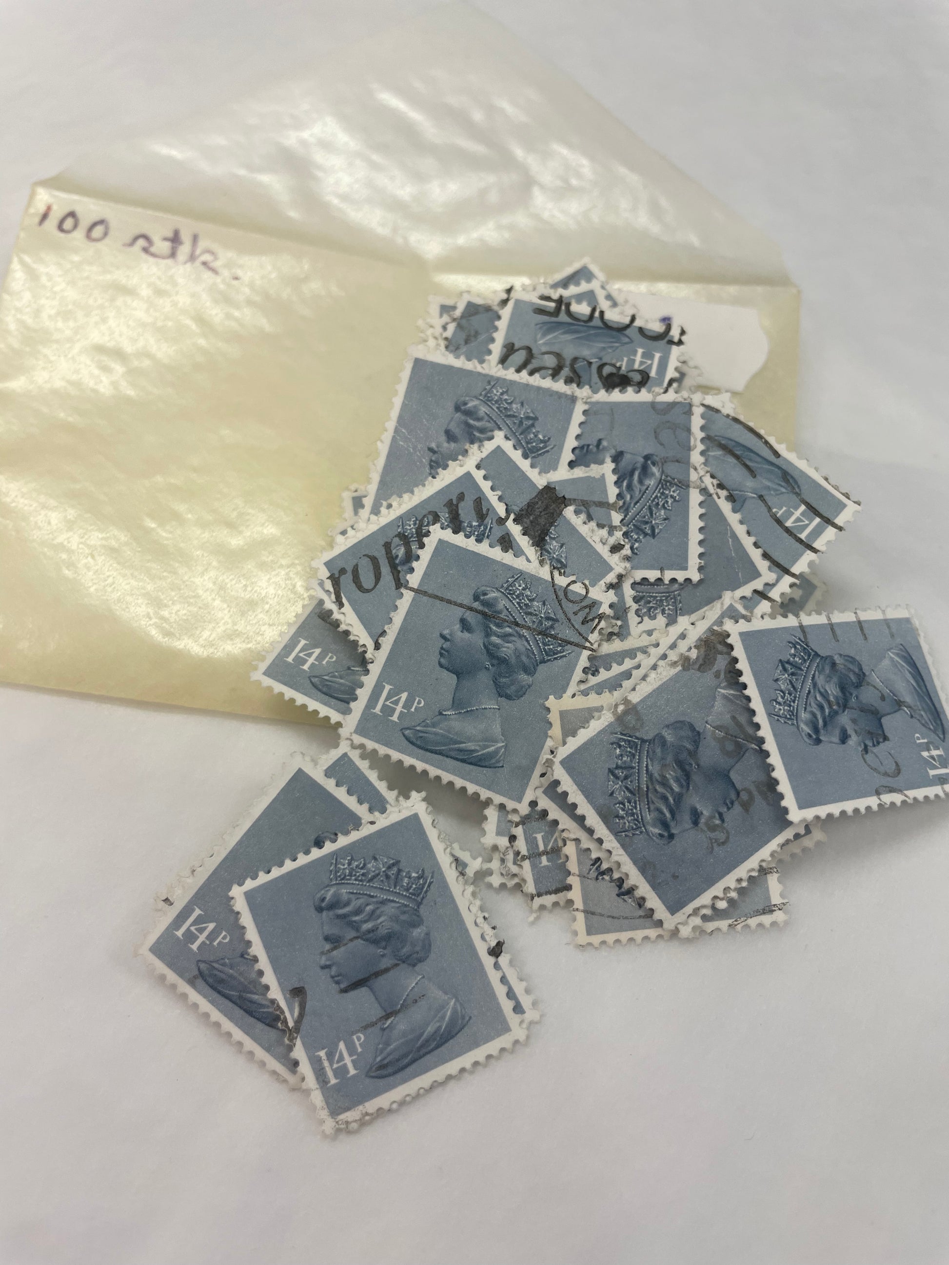 100 stk frimerker med Queen Elizabeth 2 . Mange med stempel på, godt bevart i frimerkekonvolutt. Selges pr stk. gi beskjed om det er ett spesielt du ønsker