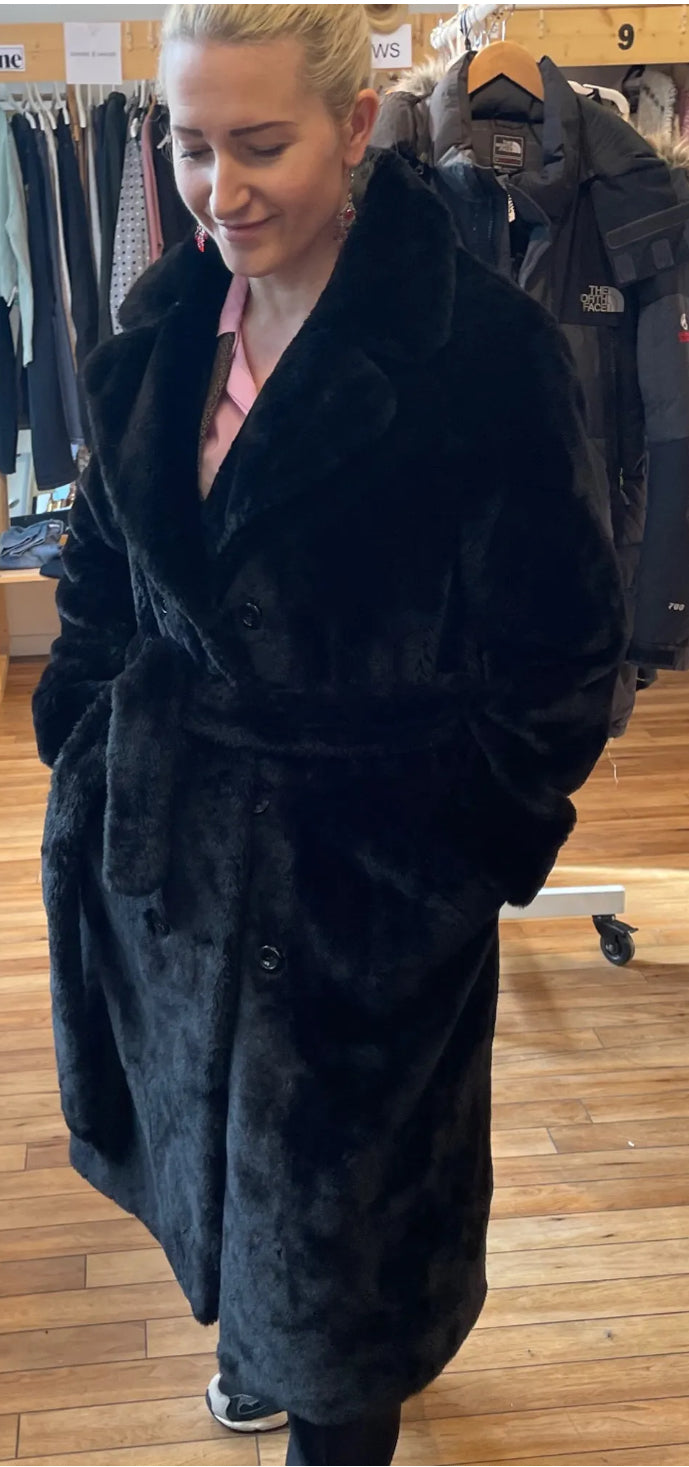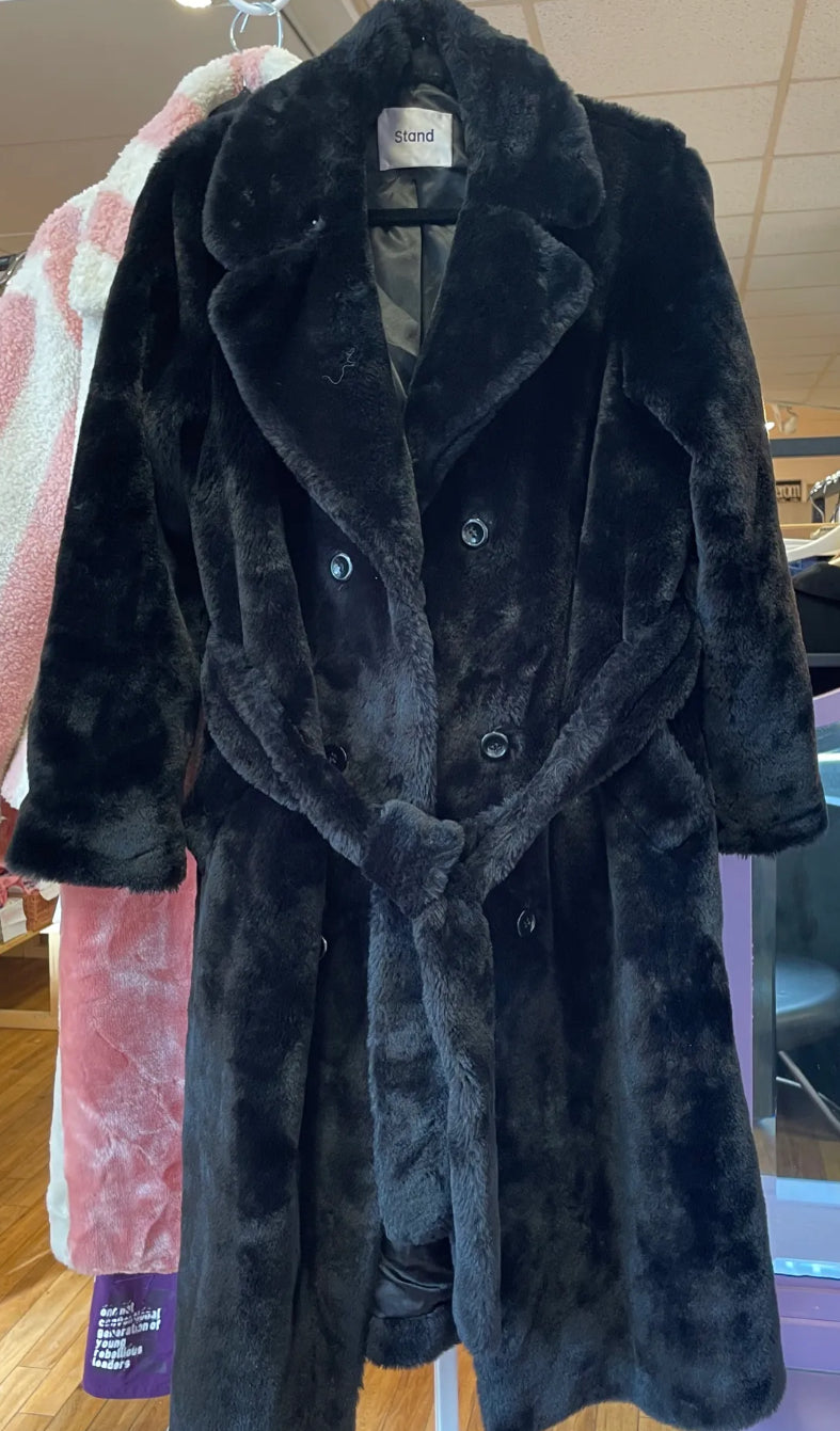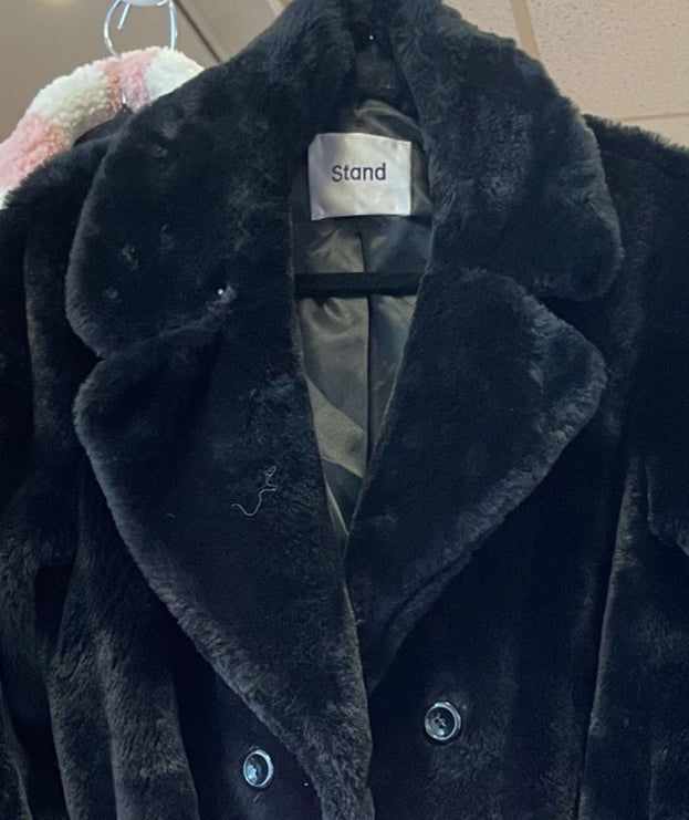 Svart sort kåpe i fuskepels pels fra Stand, str L med knapper. Second hand