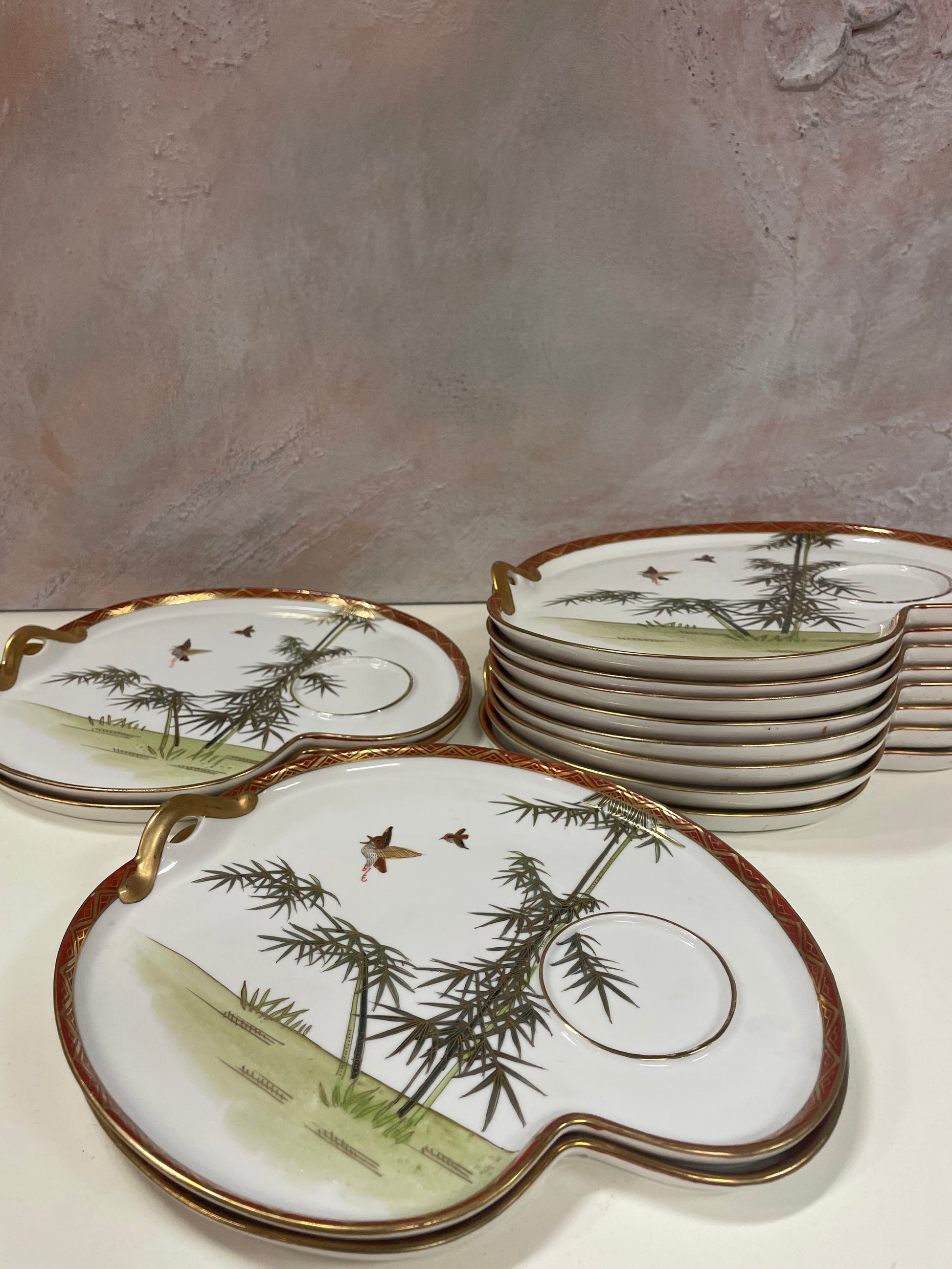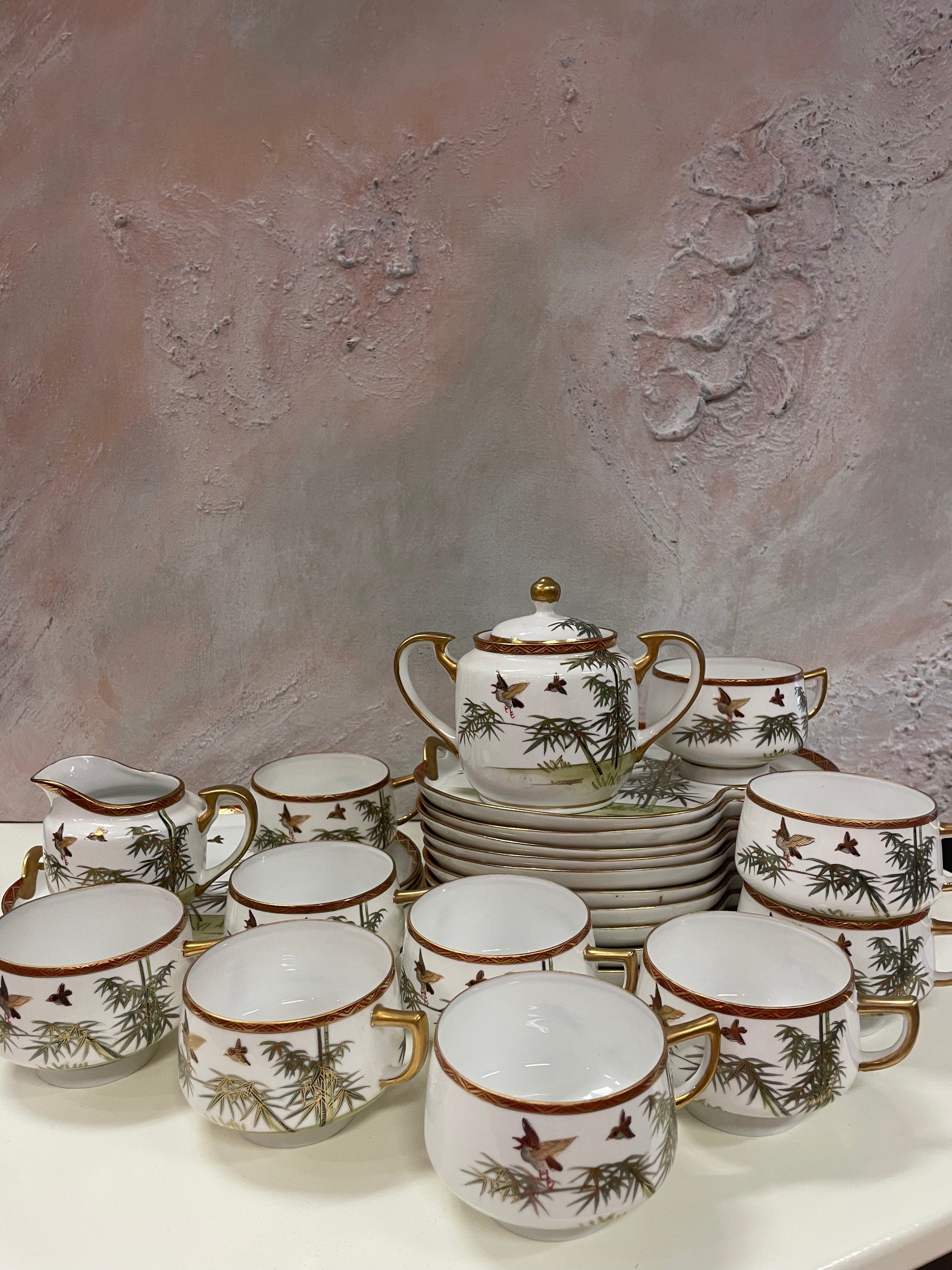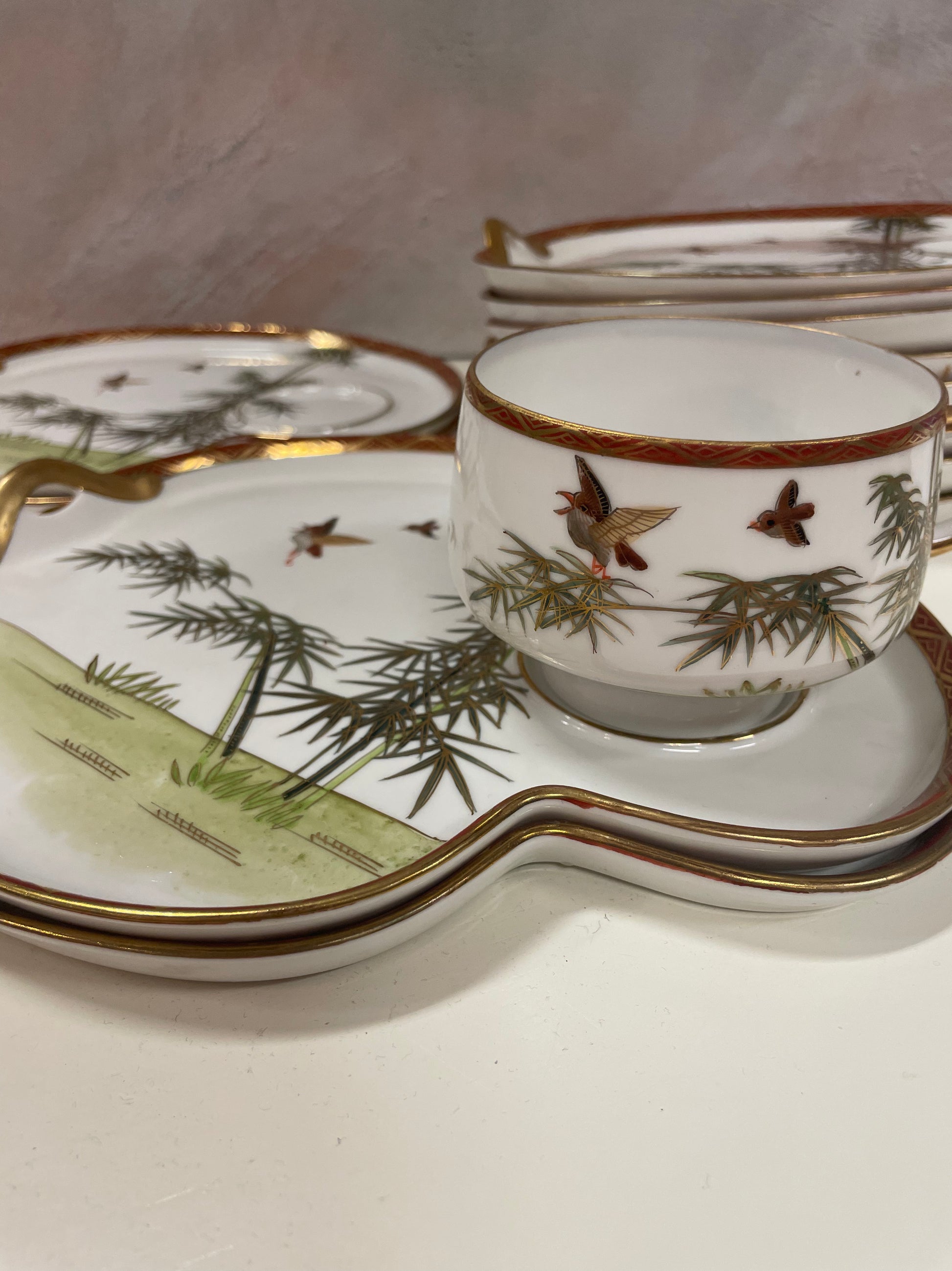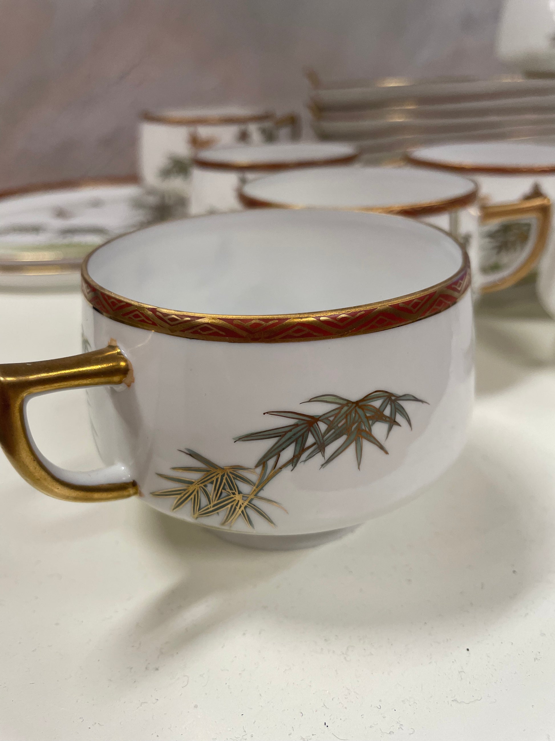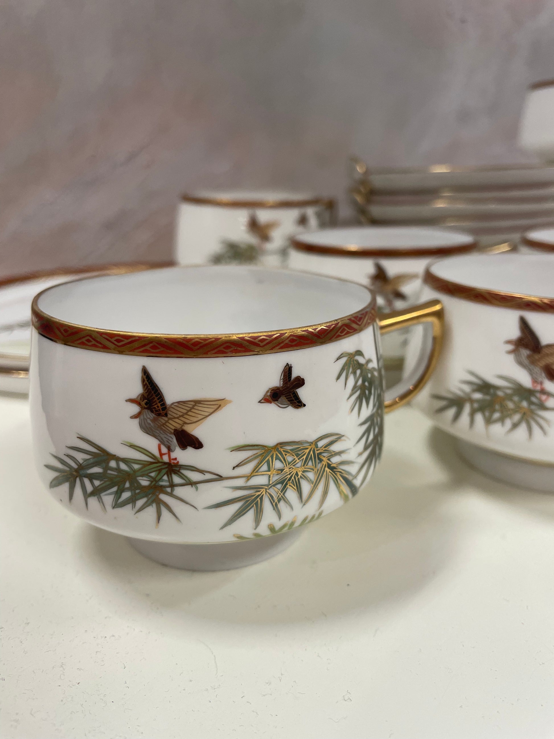 Stiler:Det finnes ulike stiler av Kutani-porselen, inkludert Ko-Kutani, Saiko Kutani, Kutani Shoza Style, Yoshidaya Style og Mokubei Style, som hver fanger ulike aspekter ved japansk kunstnerskap9 kopper 12 fat 1 fløtemugge 1 sukkerskål