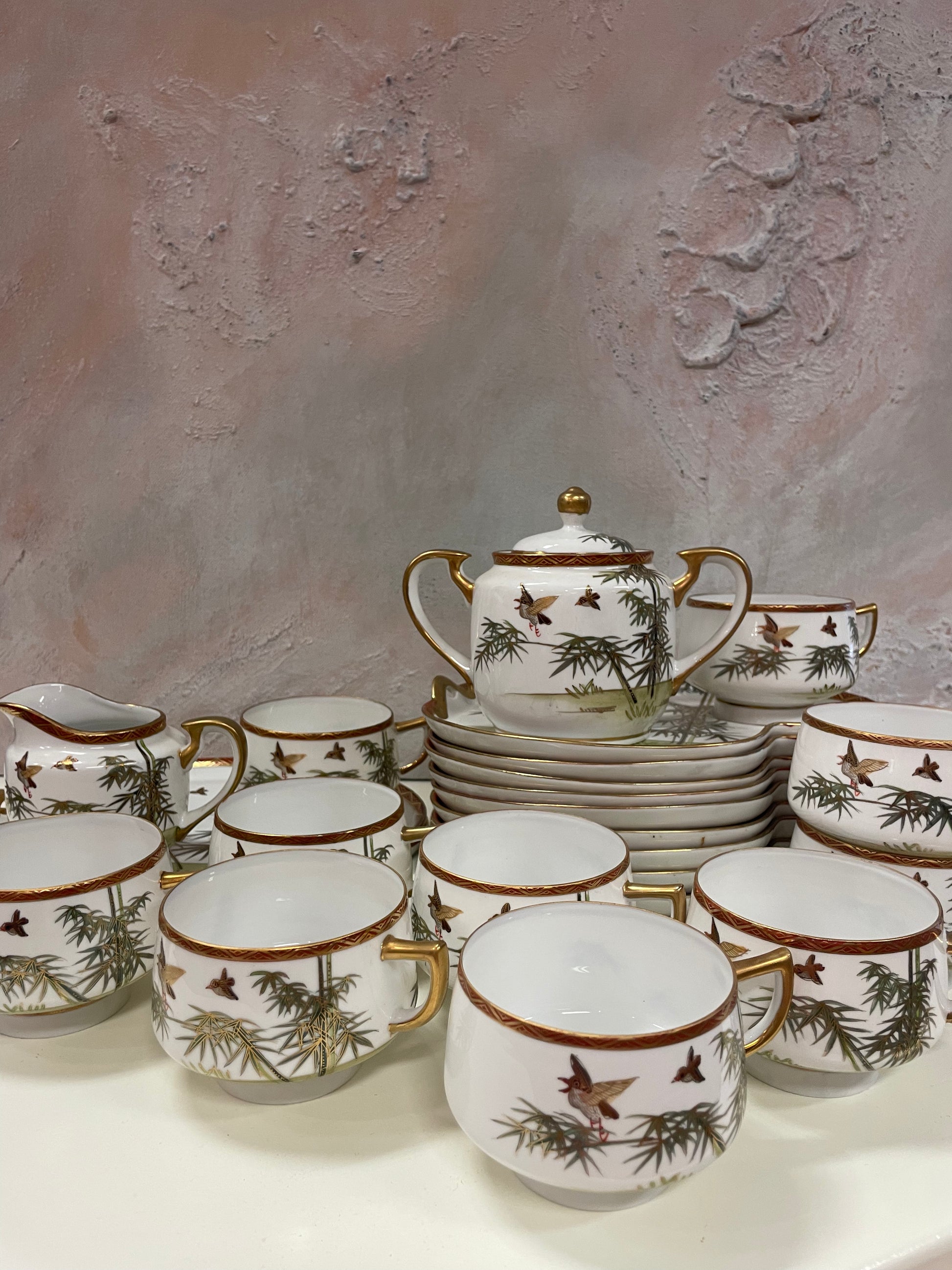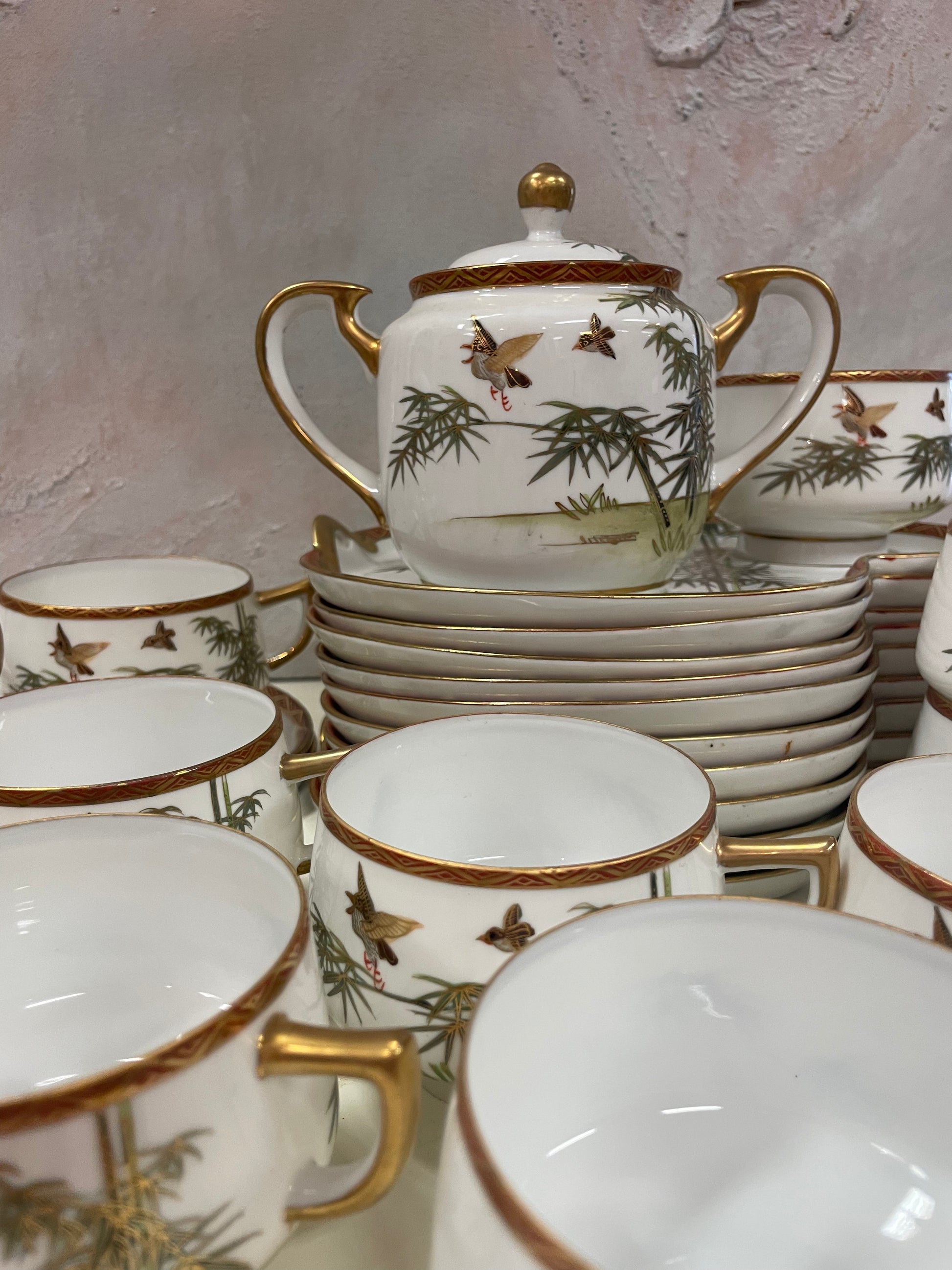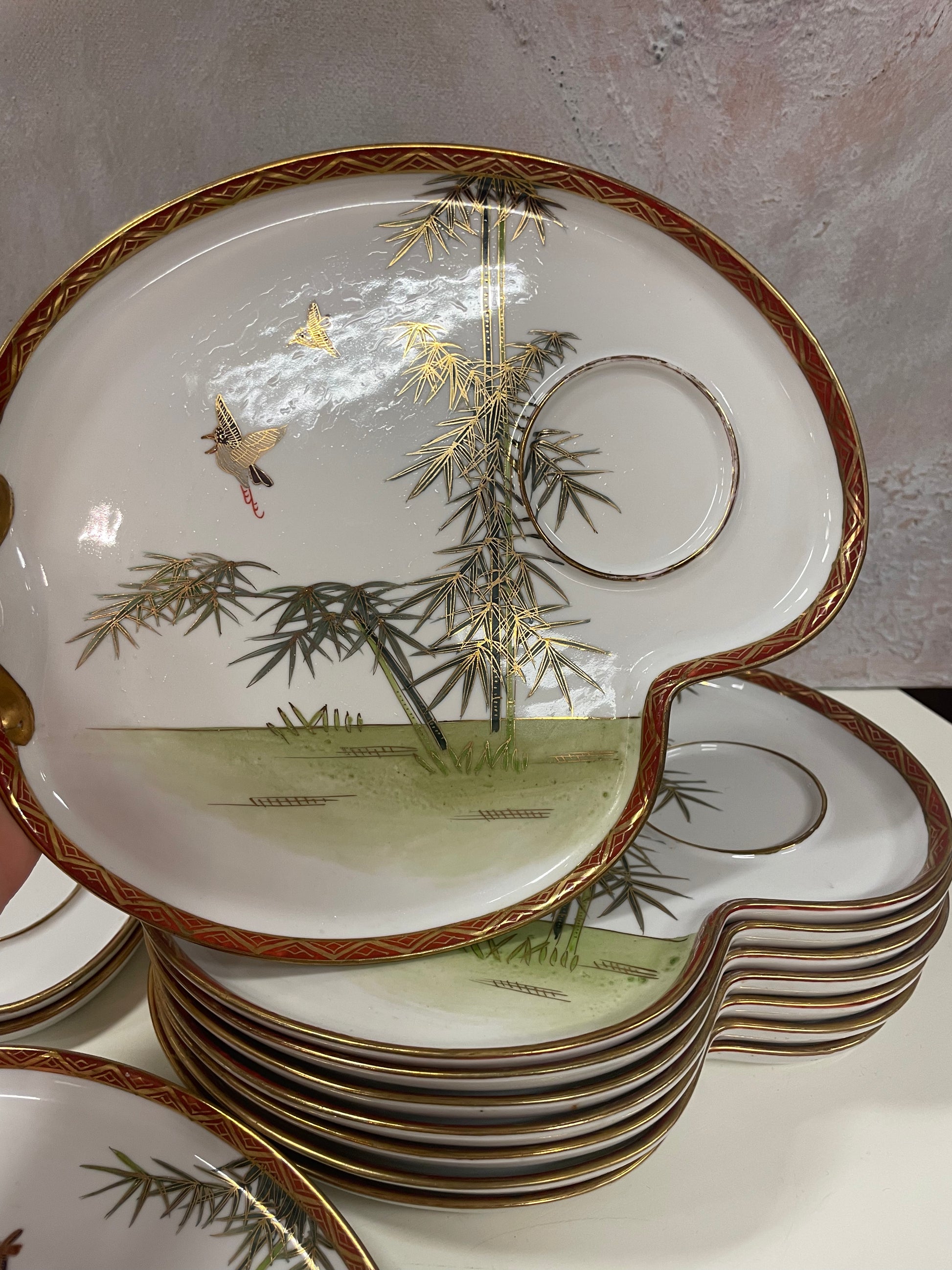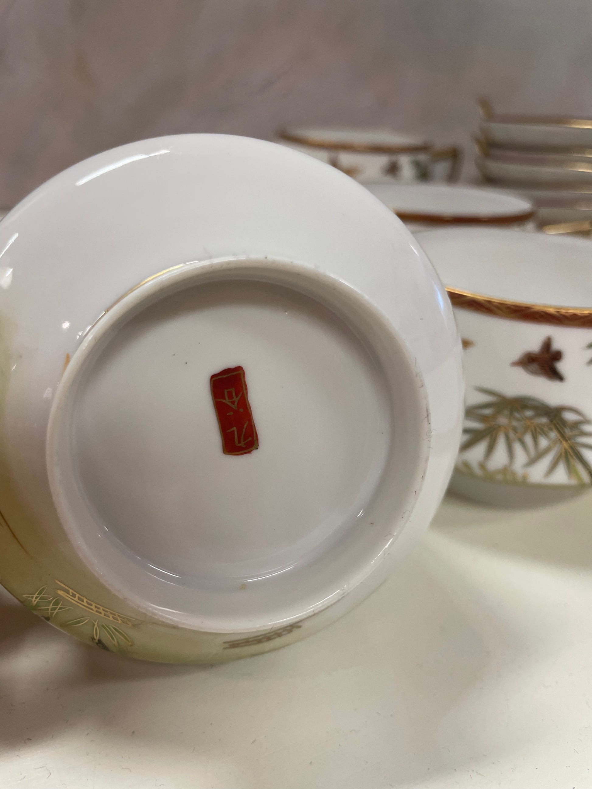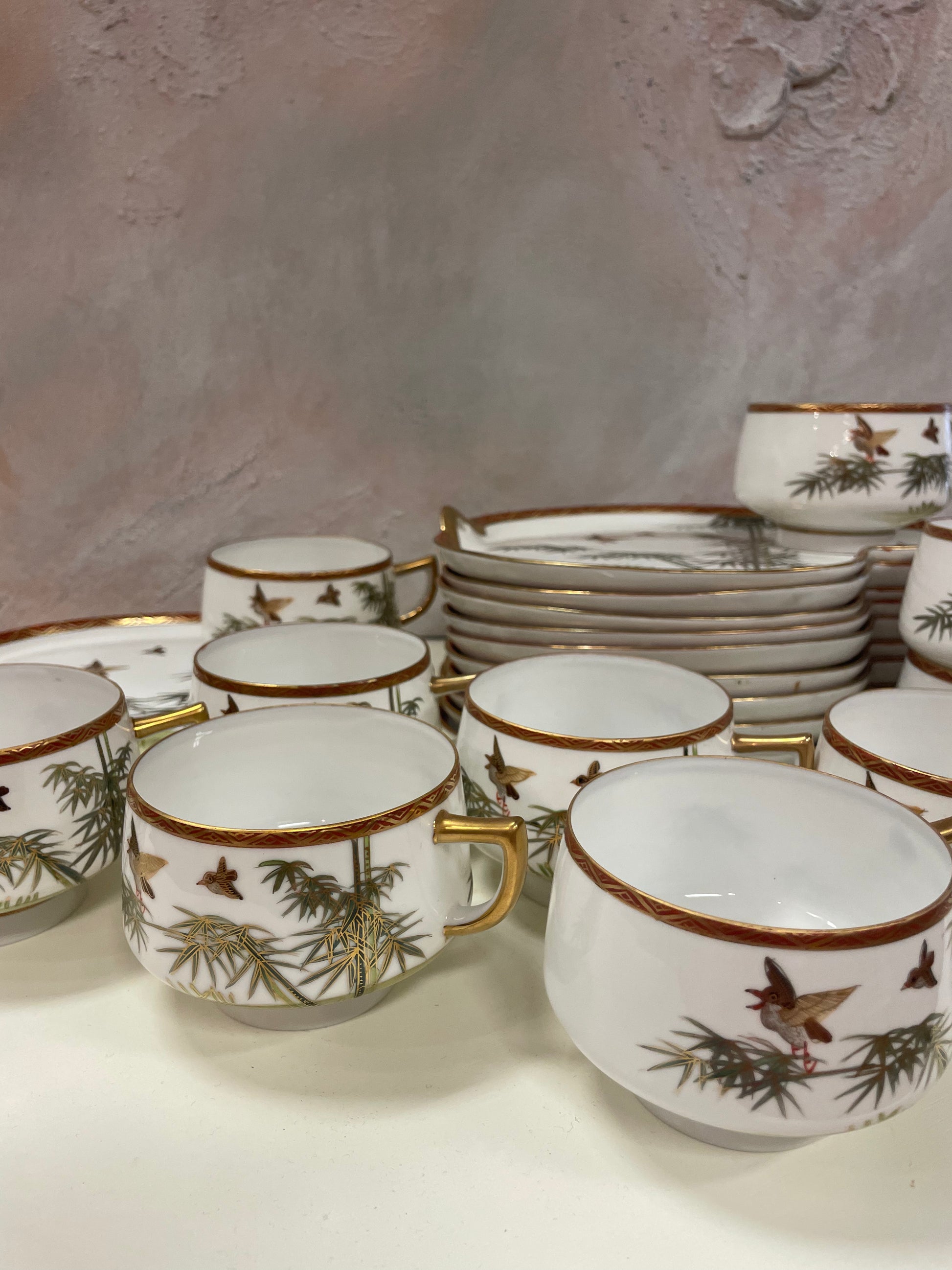 Stiler:Det finnes ulike stiler av Kutani-porselen, inkludert Ko-Kutani, Saiko Kutani, Kutani Shoza Style, Yoshidaya Style og Mokubei Style, som hver fanger ulike aspekter ved japansk kunstnerskap9 kopper 12 fat 1 fløtemugge 1 sukkerskål