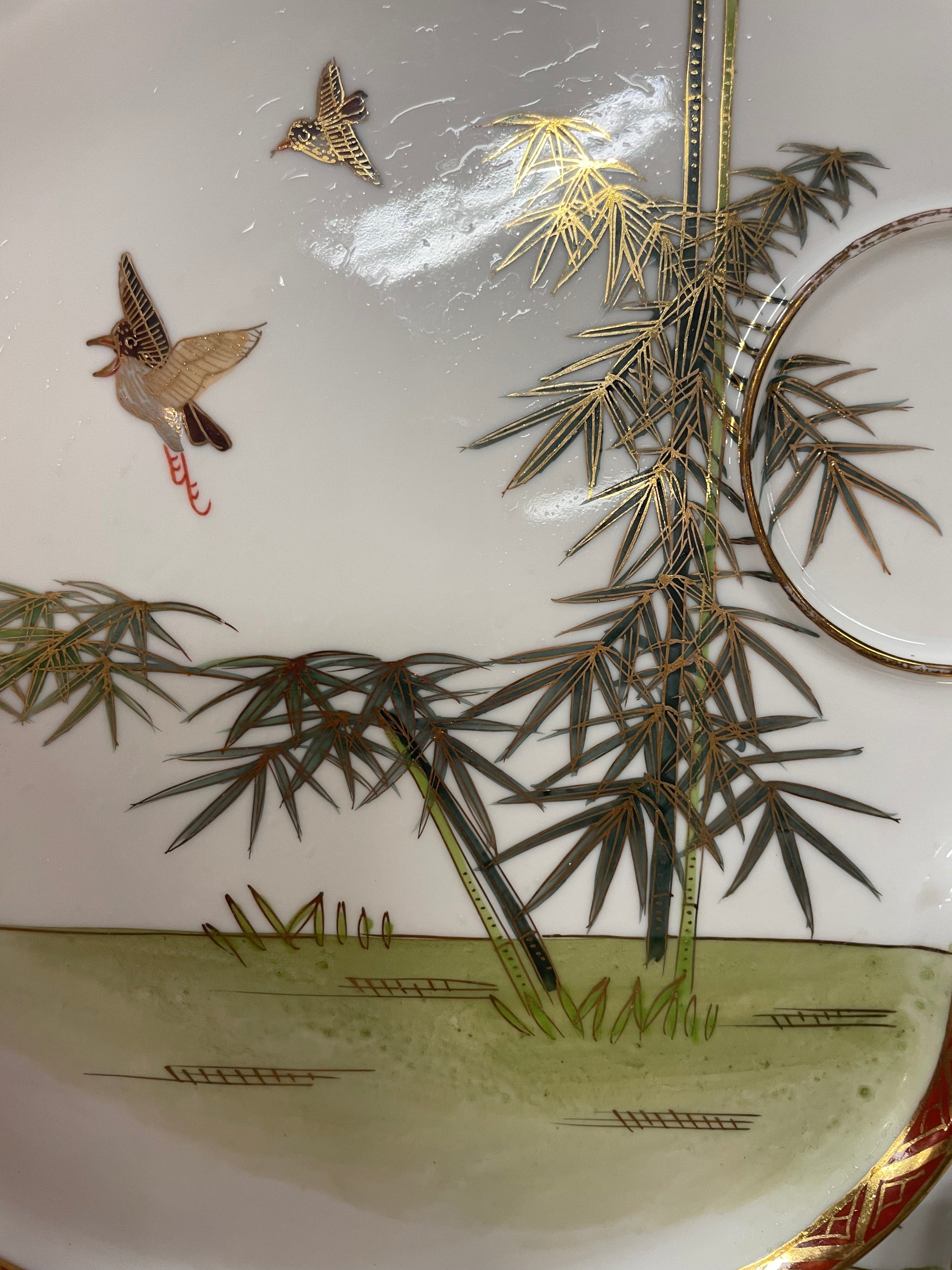 Kjennetegn:Kutani-porselen er kjent for sin bruk av mange farger og intrikate håndmalte design, ofte med gullaksenter, som reflekterer naturens skjønnhet, spesielt blomster og fugler.