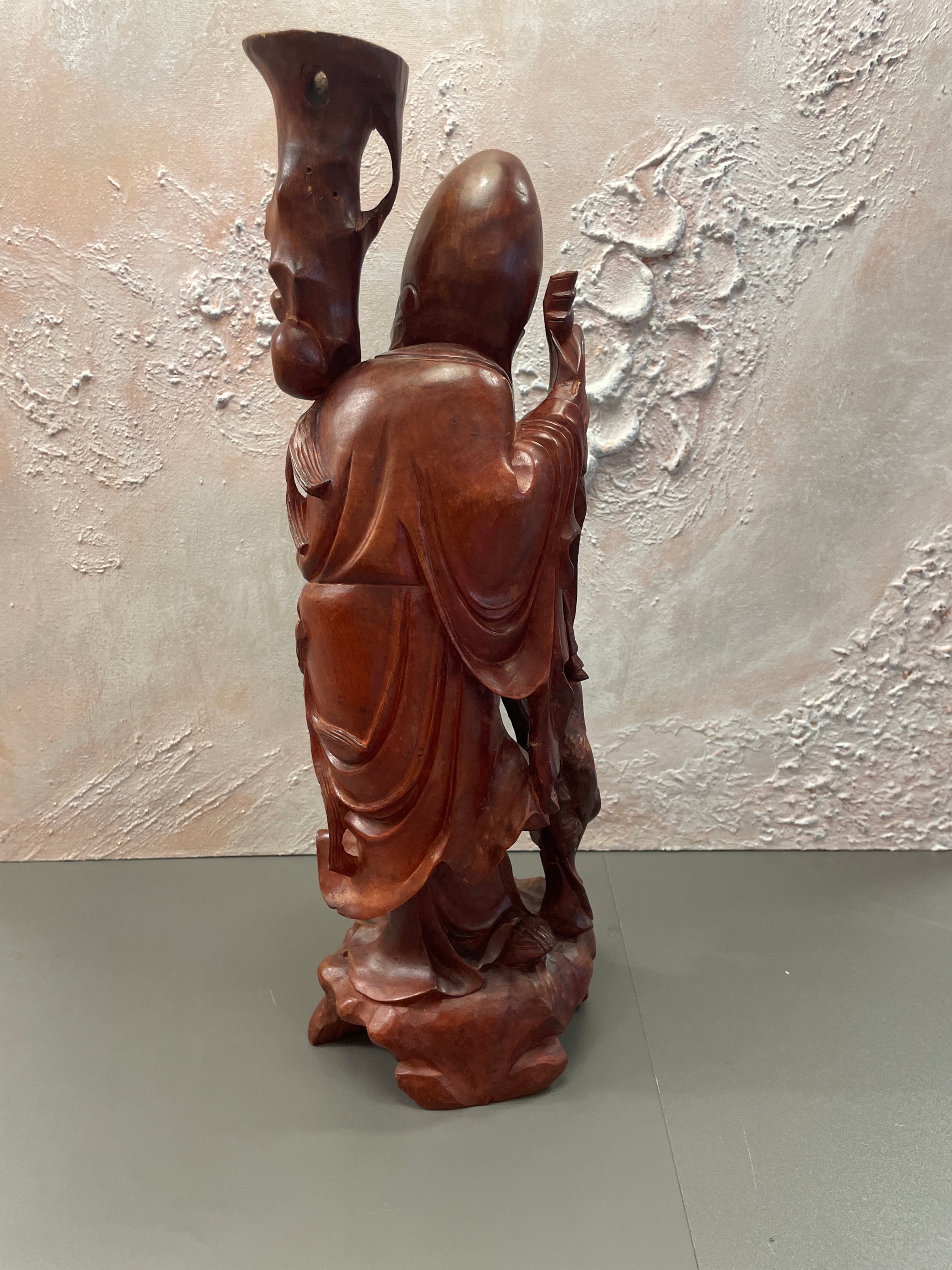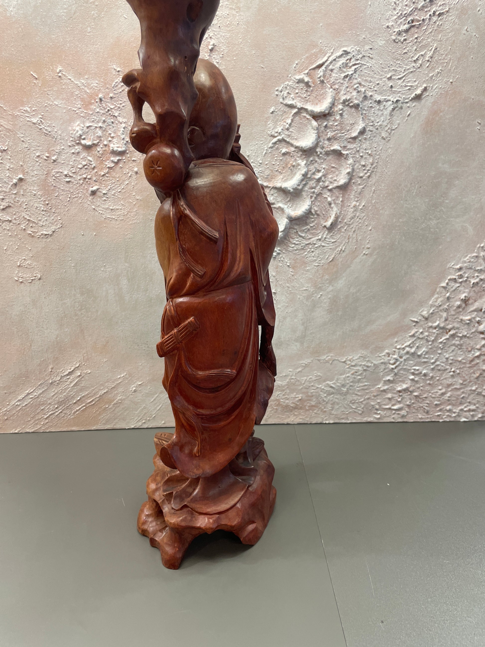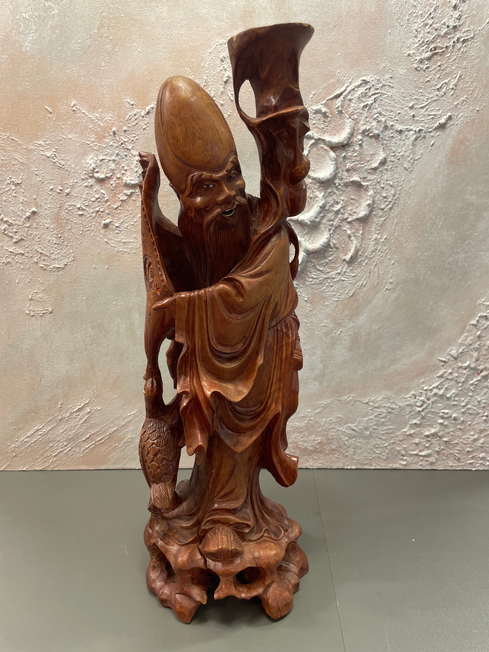 Utskåret trefigurer som representerer Schou Lao(Shouxing) den kinesiske guden for lang levetid . Utskåret i tre. Høyde 46 cm bredde 14 cm