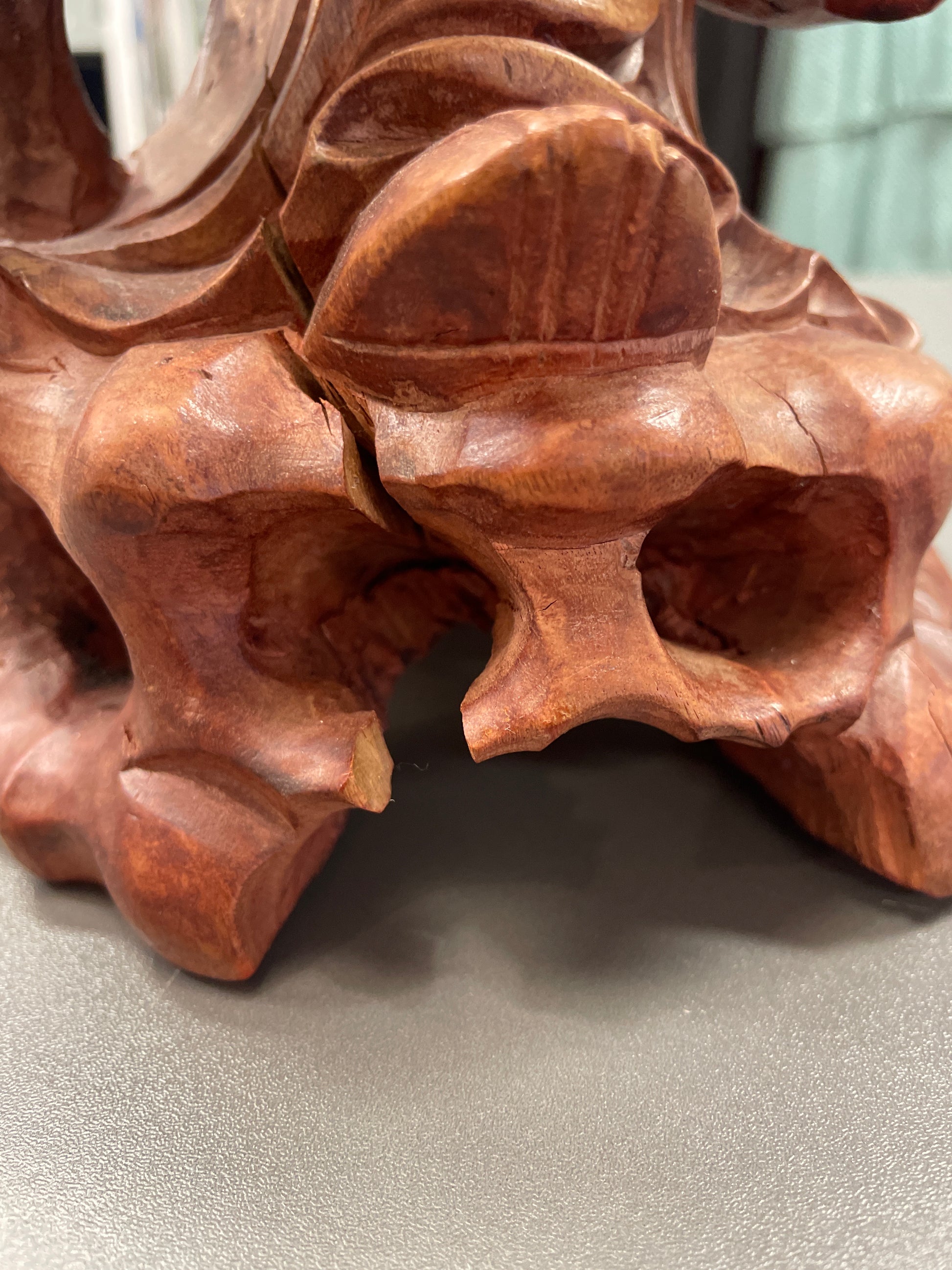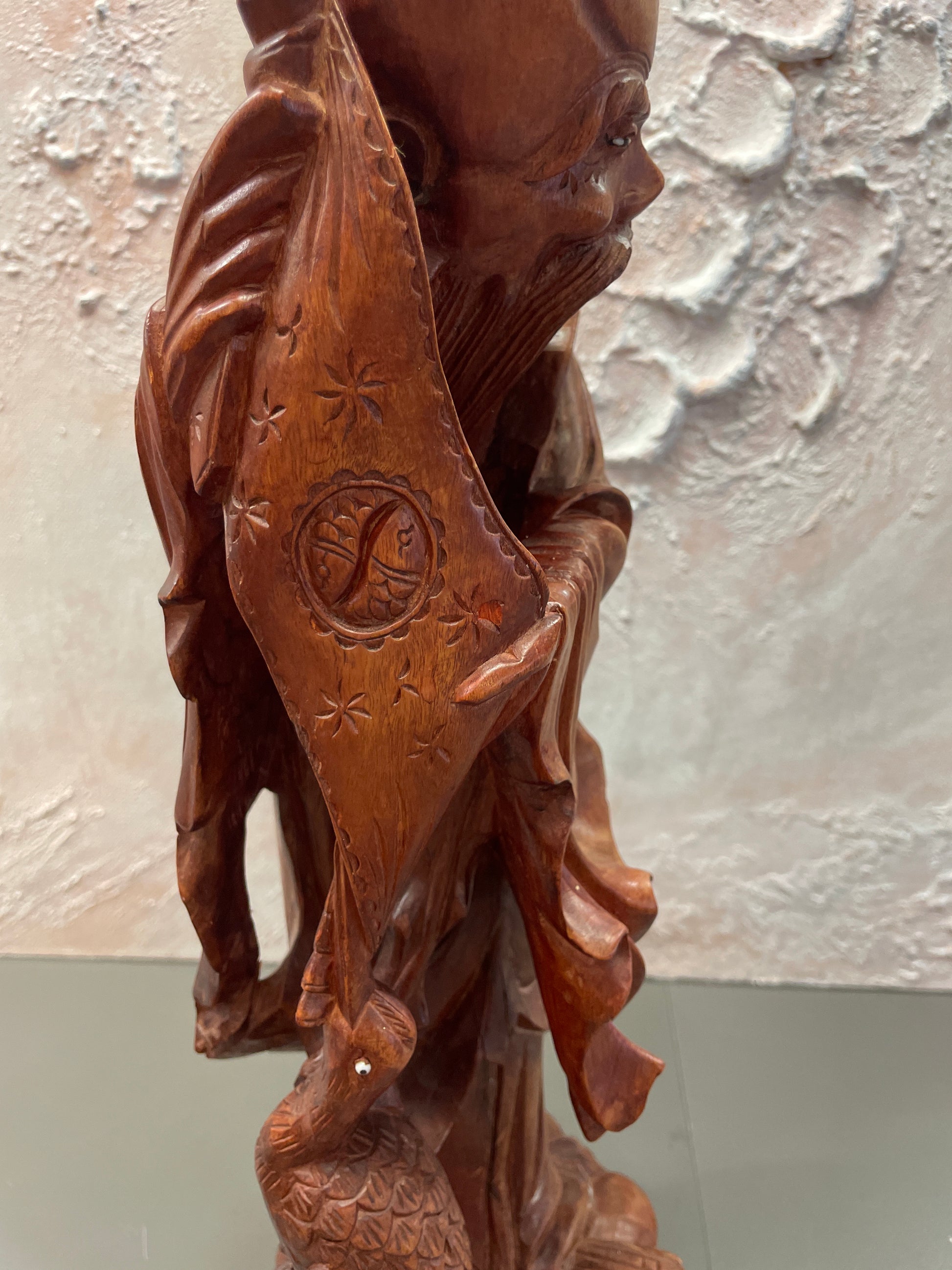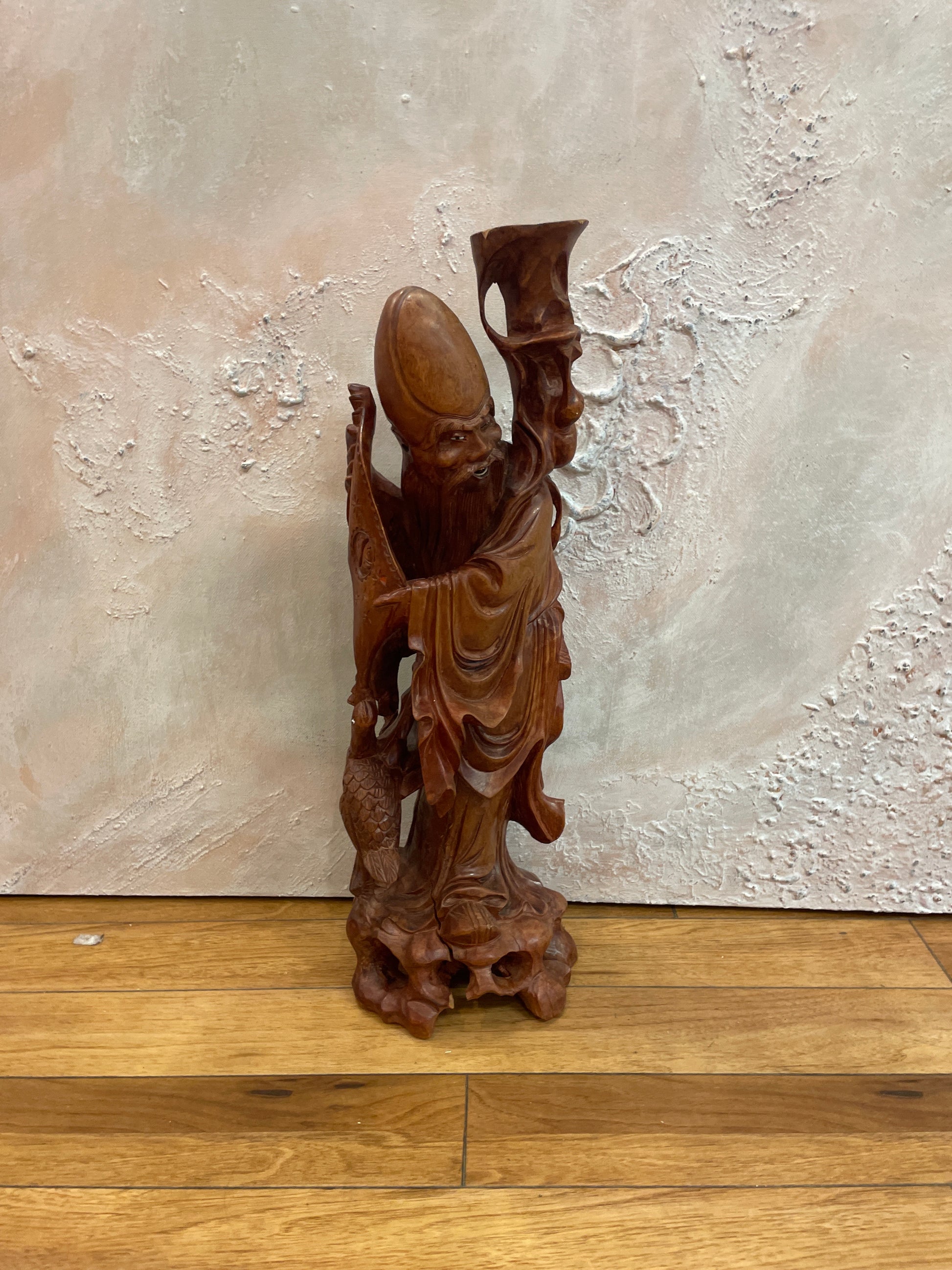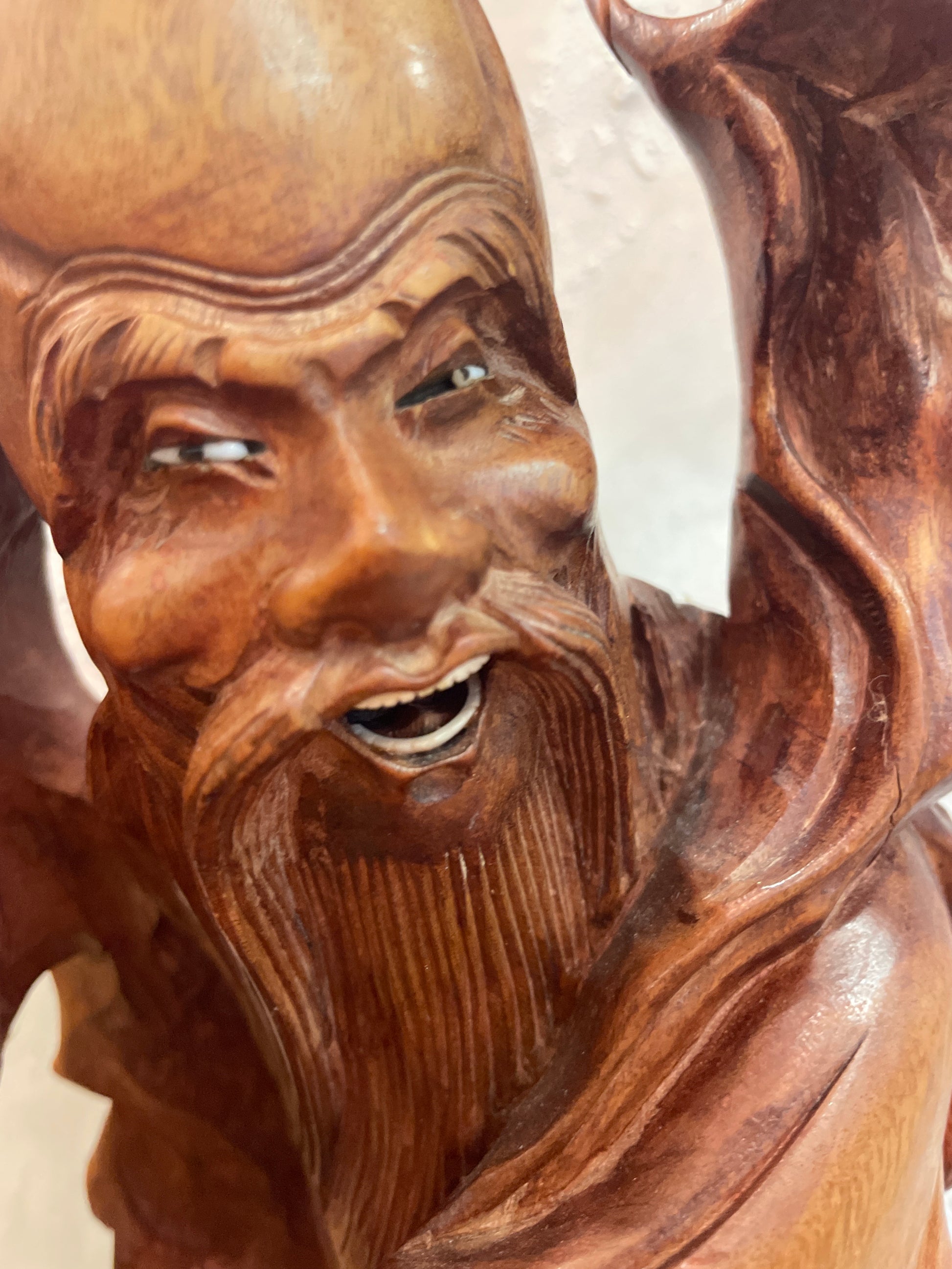 Utskåret trefigurer som representerer Schou Lao(Shouxing) den kinesiske guden for lang levetid . Utskåret i tre. Høyde 46 cm bredde 14 cm
